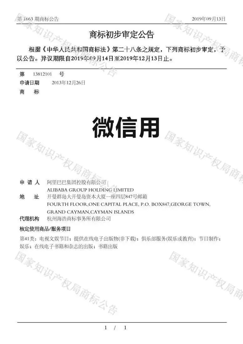近日,国内知识产权局官方(以下简称官方)作出第1663期商标公告,初步审定阿里巴巴集团控股有限公司(以下简称阿里巴巴)申请的第13812101号商标“微信用”核准注册。该商标被核定使用在第41类电视文娱节目、出版等服务上。